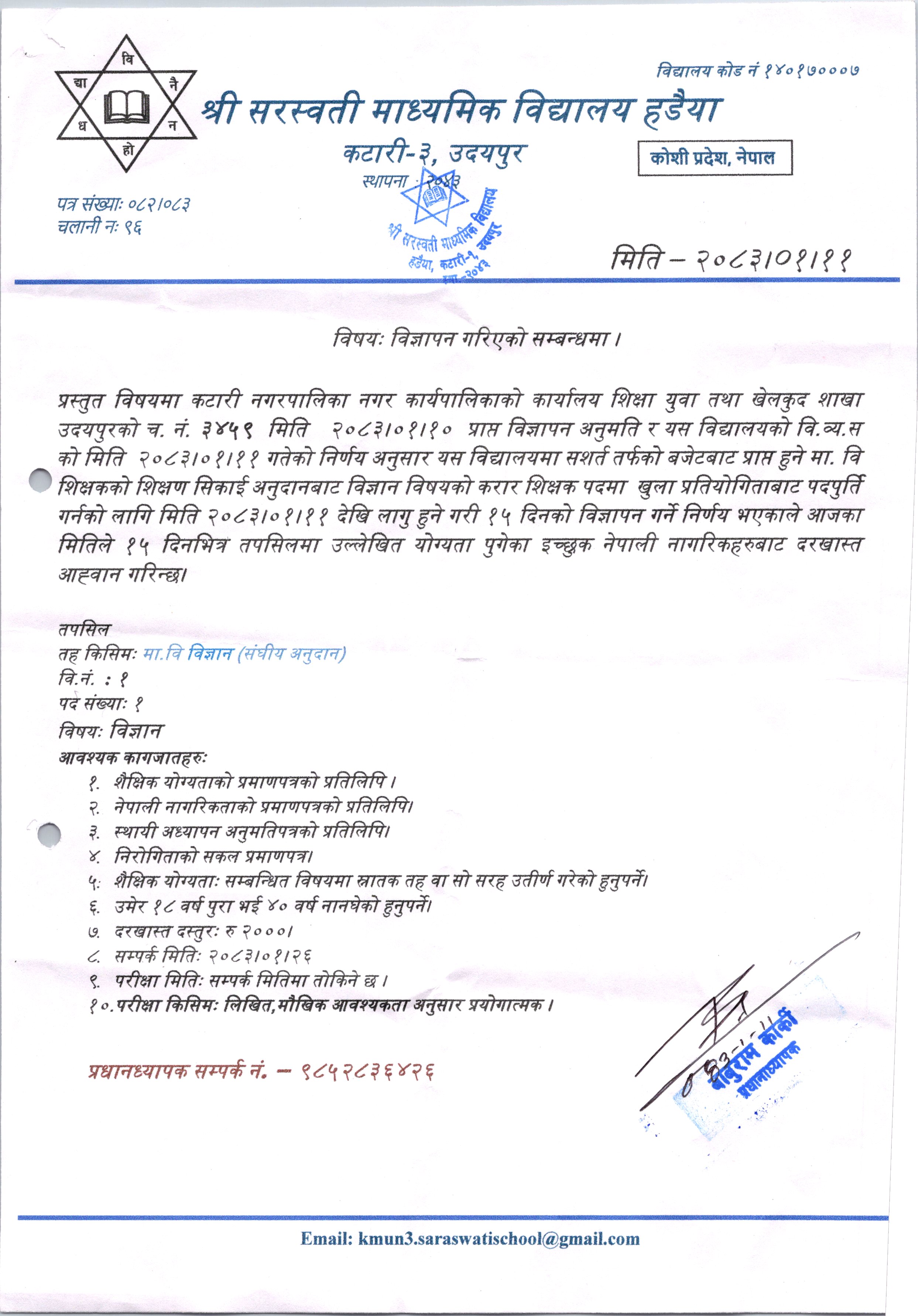 » श्री सरस्वती माध्यमिक विद्यालयको लागि विज्ञान शिक्षक आवश्यकता सम्बन्धी सूचना l