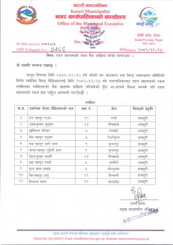 राहत सहायता रकम बैंक दाखिला सम्बन्धमा।