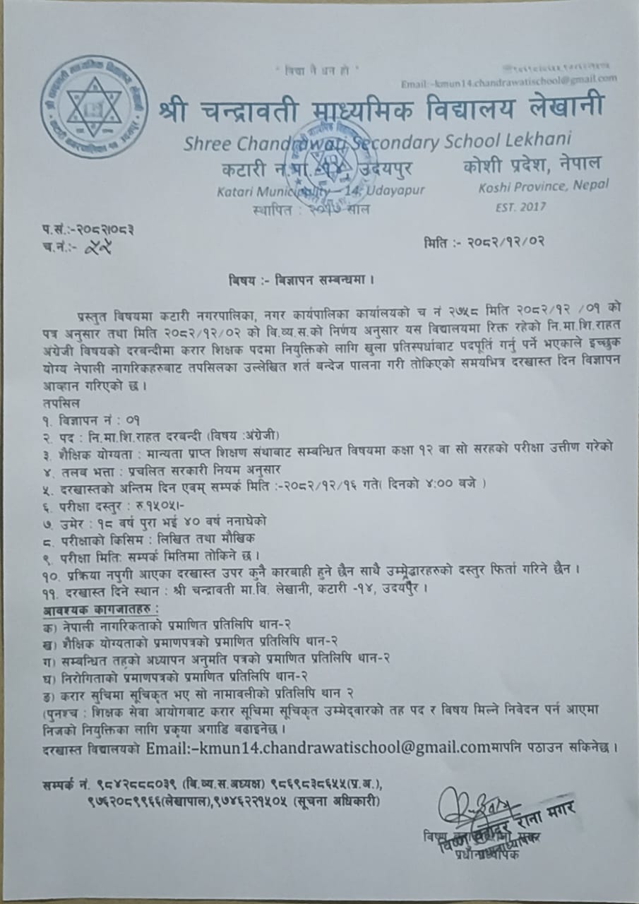 श्री चन्द्रावती माध्यमिक विद्यालय लेखानीमा नि.मा.वि. राहत दरबन्दी (अंग्रेजी विषय) शिक्षक माग सम्बन्धी सूचना ।