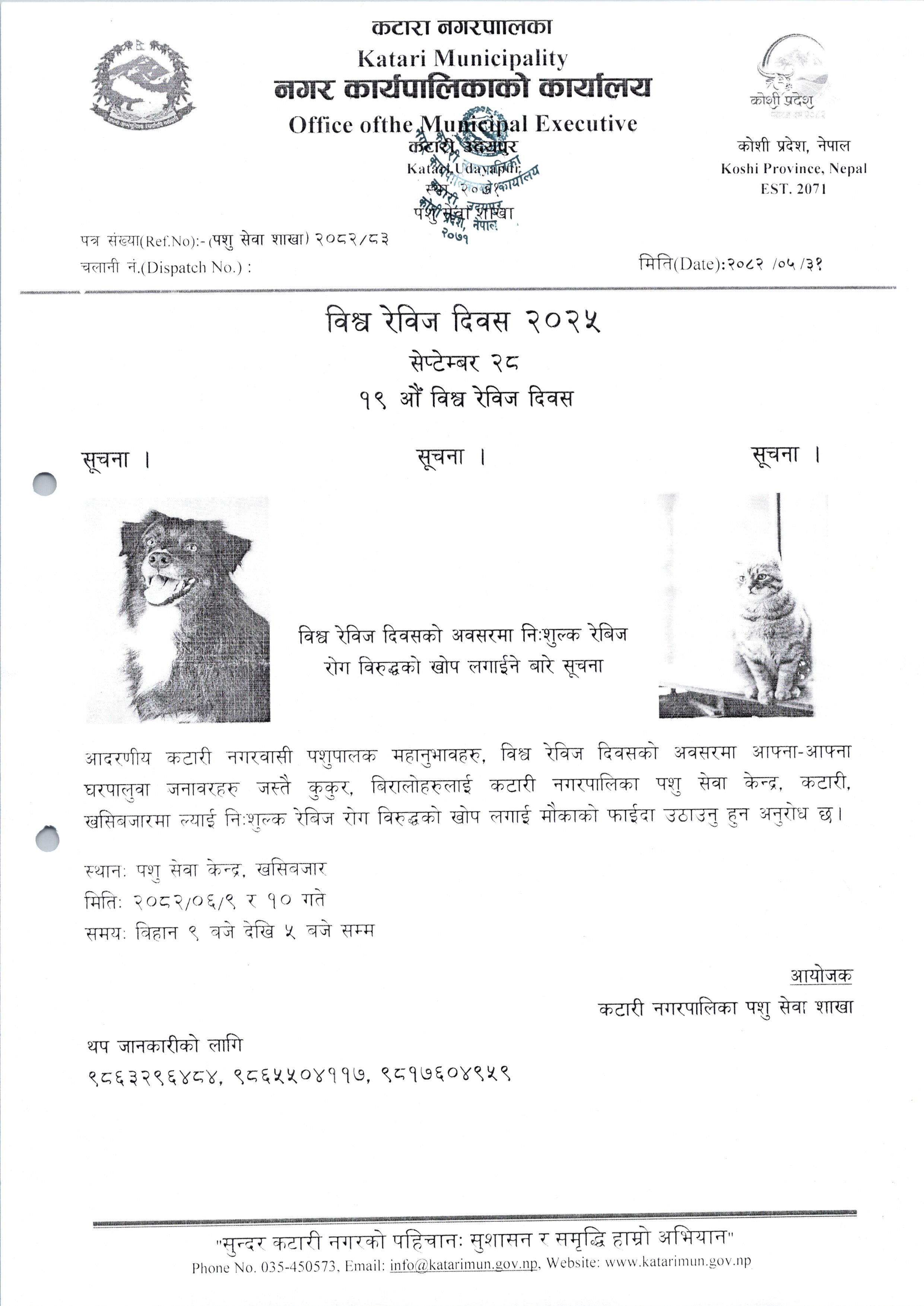 विश्व रेविज दिवसको अवसरमा नि:शुल्क रेविज रोग विरुद्ध खोप लगाइने सम्बन्धी सूचना ।