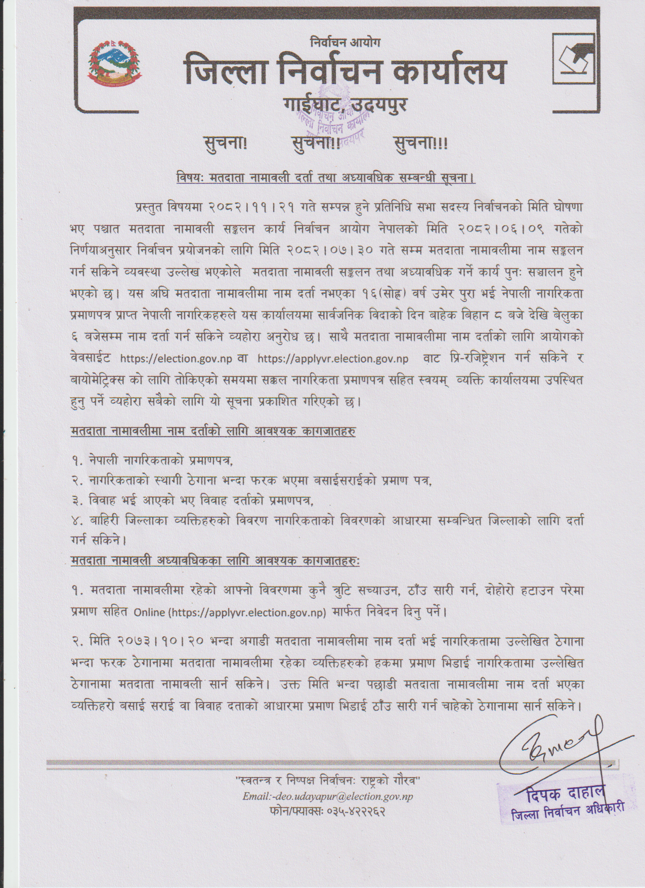 मतदाता नामावली दर्ता तथा अध्यावधिक सम्बन्धी जिल्ला निर्वाचन कार्यालय, उदयपुरको सूचना।